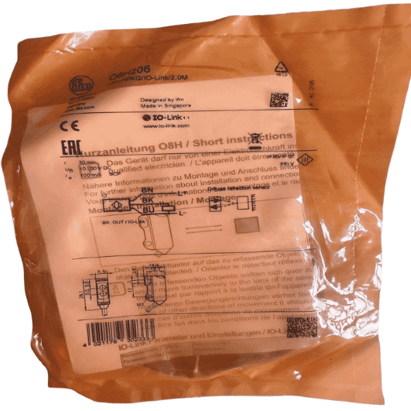 In summary, the IFM O8H206 is a high-performance diffuse reflection sensor designed for precision and reliability. Featuring red light technology, background suppression, a compact rectangular housing, and energy-efficient operation, it offers robust detection in environments where background interference can be an issue. For engineers and operators seeking a dependable optical sensor for space-limited industrial applications, the O8H206 is an excellent solution.