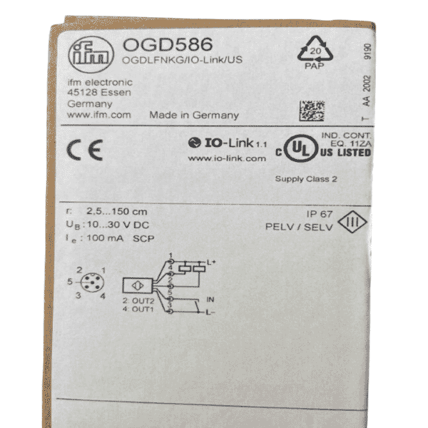 With a sensing range of 0.03 to 1.5 metres, the OGD586 is a versatile solution for both short- and mid-range applications. This range is particularly useful in environments such as packaging, logistics, and material handling, where the sensor can be used to verify product presence, measure stack heights, monitor object flow, or check component positioning. The flexibility of its range makes it suitable for a broad spectrum of automated processes.